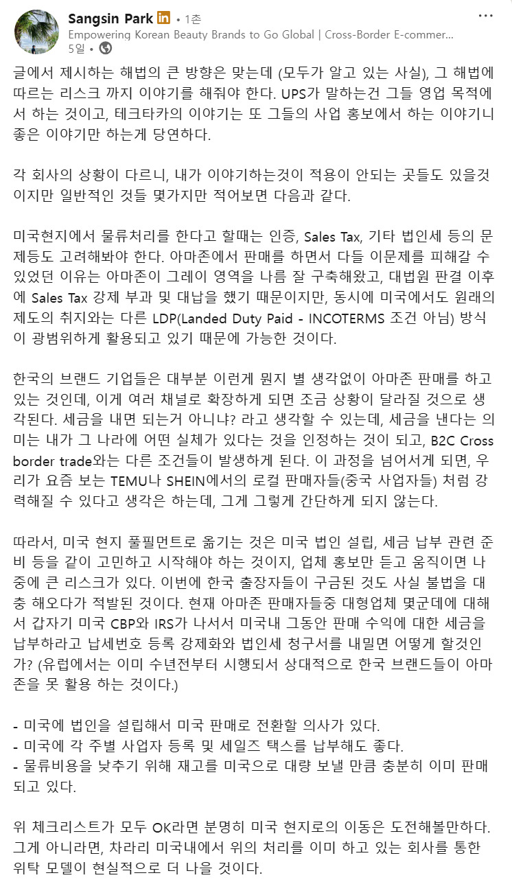 미국 현지 풀필먼트센터 활용에 대한 박상신 파트너의 의견 ⓒ박상신 파트너 링크드인 포스팅 발췌