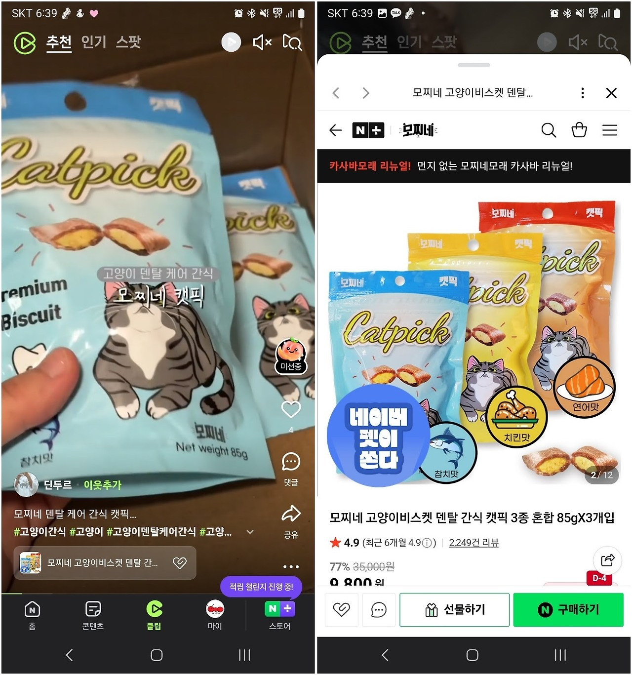 네이버 앱 클립탭에 연결된 쇼핑 커넥트의 모습. 네이버 클립의 경우 ‘상품 태그’ 형태로 영상 내 구매 링크가 자연스럽게 삽입되는 모습이다. ⓒ네이버 앱 캡처